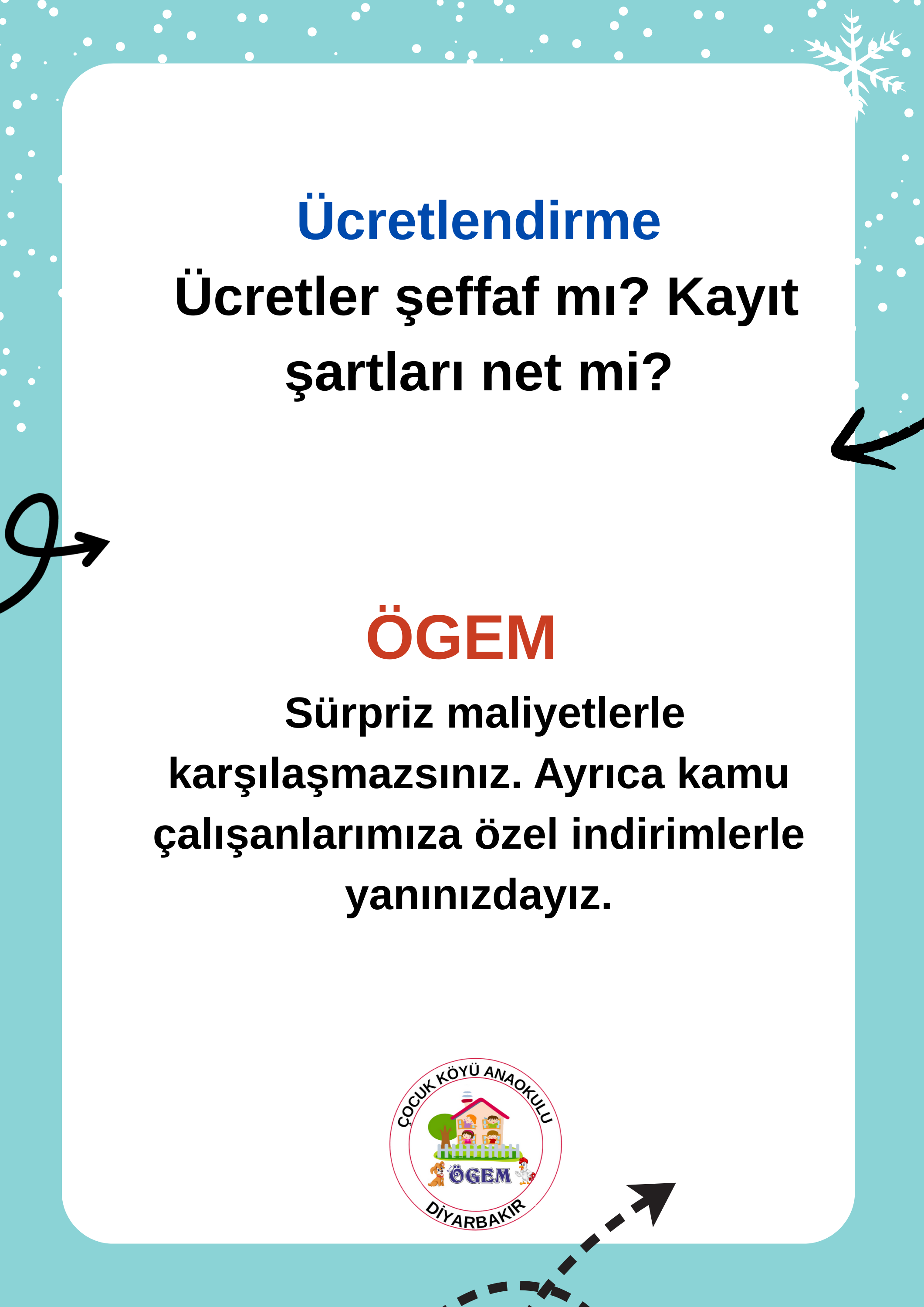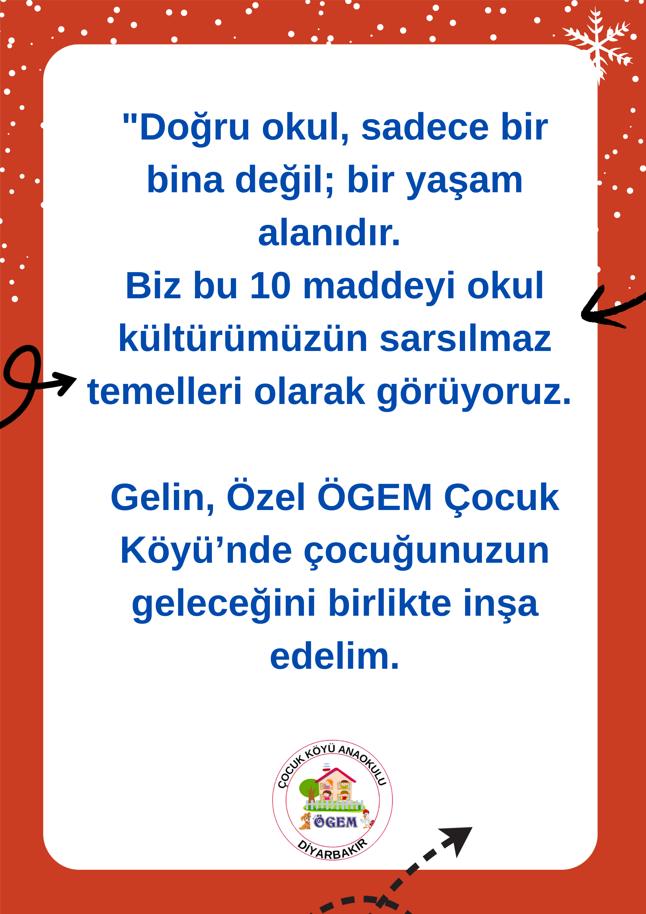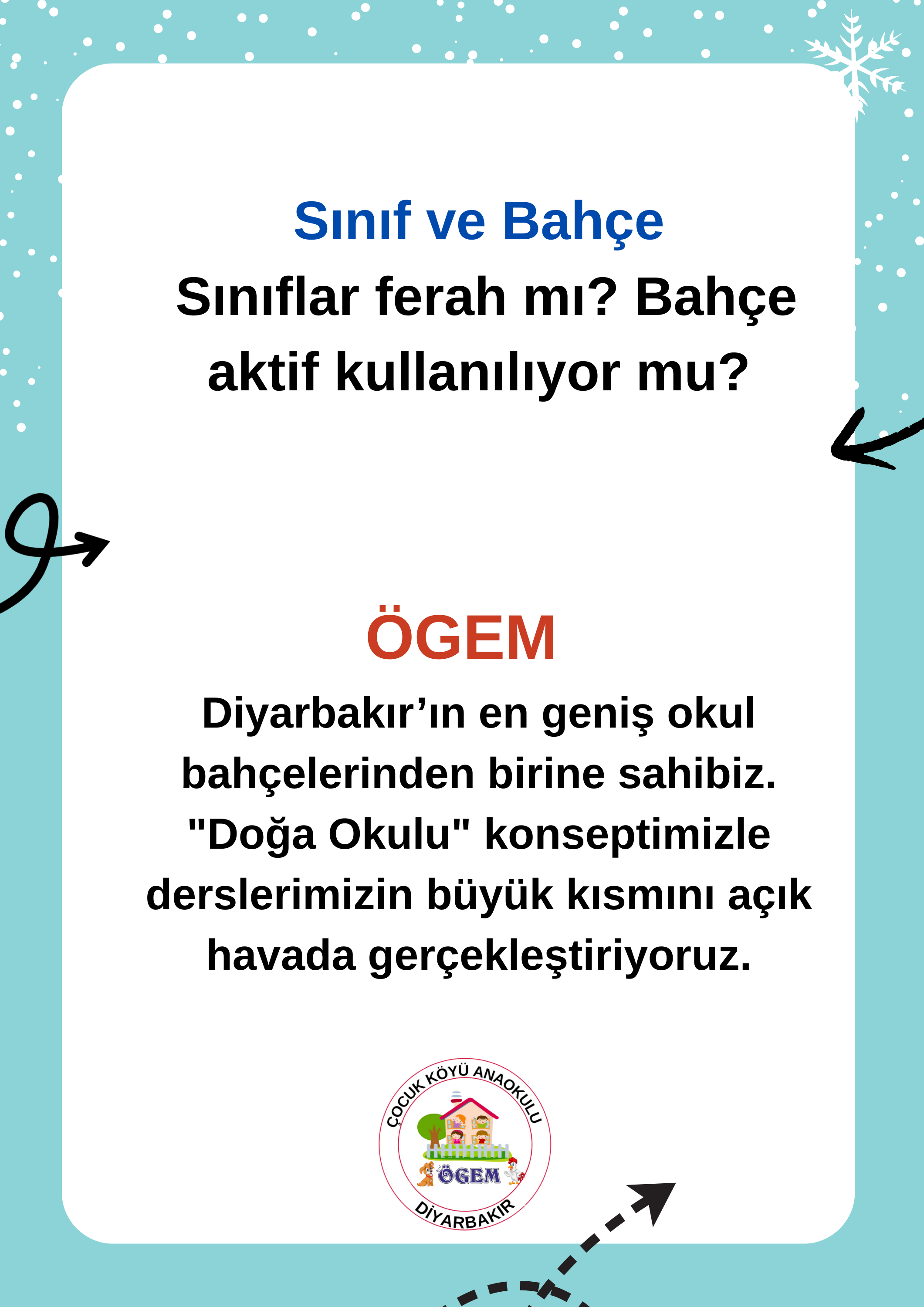 Diyarbakır’da anaokulu arayışında olan velilerimiz için Özel ÖGEM Çocuk Köyü, uluslararası eğitim modellerini (Reggio Emilia & HighScope) doğa ile iç içe bir ortamda sunuyor. Şeffaf yönetim anlayışımız, uzman kadromuz ve kamu çalışanlarına özel indirim seçeneklerimizle, çocuklarımıza güvenli ve mutlu bir gelecek hazırlıyoruz.